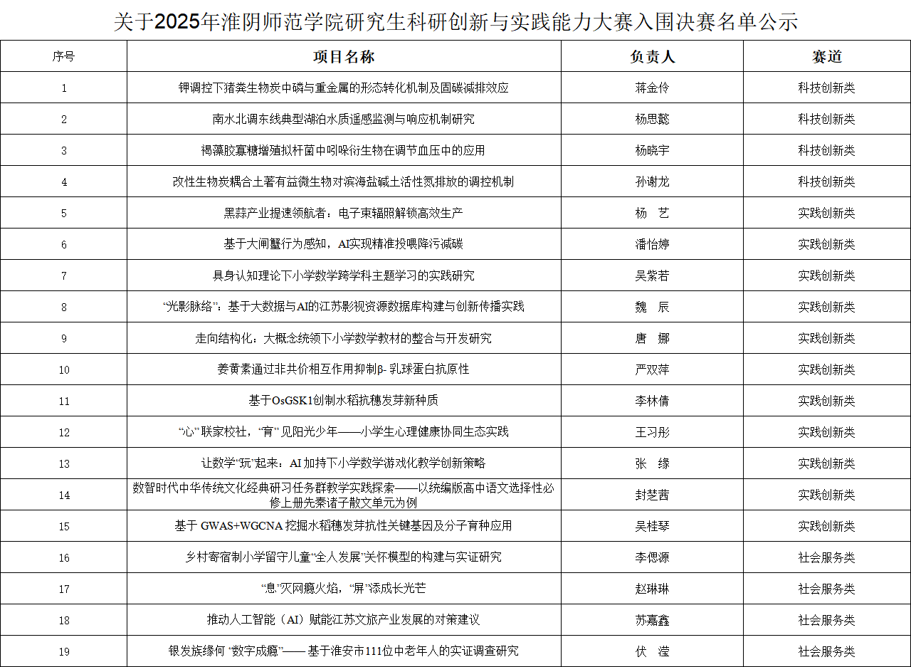 关于2025年淮阴师范学院研究生科研创新与实践能力大赛入围决赛名单公示