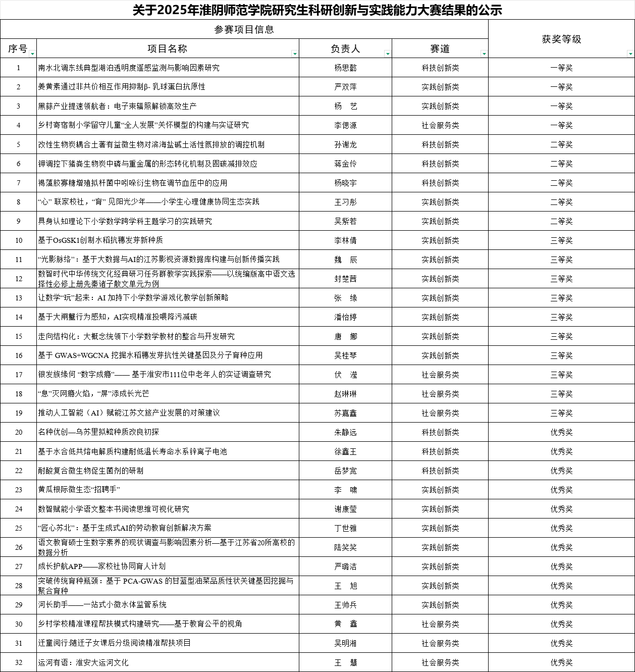 根据《关于开展2025年淮阴师范学院研究生科研创新与实践能力大赛的通知》(研发〔2025〕37号)工作安排,经过现场答辩、专家评审,大赛共评出校级一等奖4项,二等奖5项,三等奖10项,优秀奖13项,现将评选结果进行公示(见附件)。